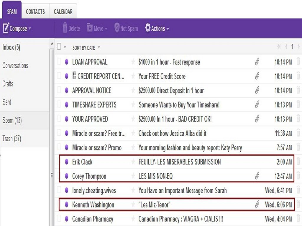My office replied to a number of unrepresented actors to offer audition appointments. Too many of the audition appointments sent to actors utilizing various e-mail servers (the most popular among actors being Gmail), were diverted into actors’ spam folders. A director’s request for an actress could not sway Yahoo from swiping away the young thespian’s audition appointment into a spam folder. The actress had only discovered the appointment (and my office’s multiple follow-up inquiries) in her spam folder after her audition day came and went.