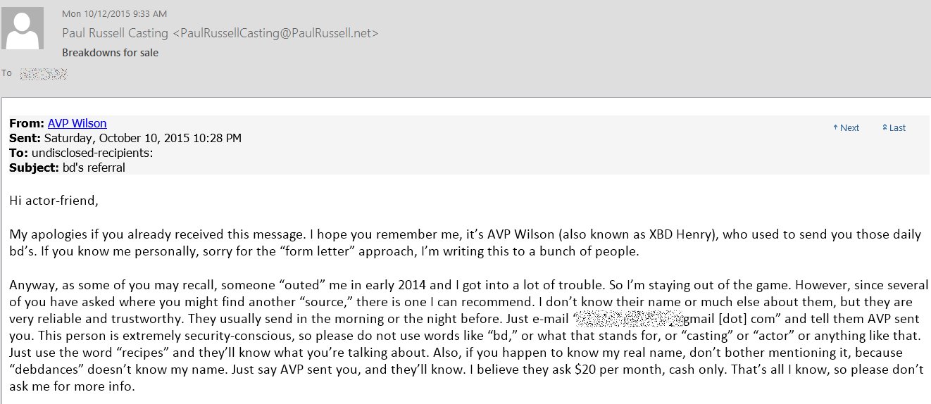 The manager’s solicitors offer for a higher cost to the actor, access to breakdowns from Breakdown Services, coyly referred to in the manager’s marketing materials as “The Daily List.” Breakdowns released by Breakdown Services, as noted in Manager Demands Clients Pay to Play, are copy write protected and available only to talent representation by subscription once Breakdown Services has researched the talent representative as legitimate. Breakdown Services’ screening process is seemingly encountering flaws