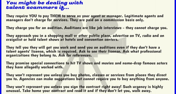 Legit (TV, film & theater) talent agents and reputable talent managers with unblemished careers have long been agitated by the questionable actions of peer talent representation misrepresenting intent to actors. Actions, sometimes violating local and state labor and/or consumer laws, that sully the trade of championing actors. Questionable practices such as charging clients $500 for representation as does as the Long Island talent manager who goes at great lengths to state publicly that she is and is not a talent manager. This talent manager also offers a per month rate payable by actors for the actor to be submitted by the manager to extras casting offices for background casting consideration. These behaviors prompt review—once again—of credible talent representation as is recognized by actor union franchised talent agents.