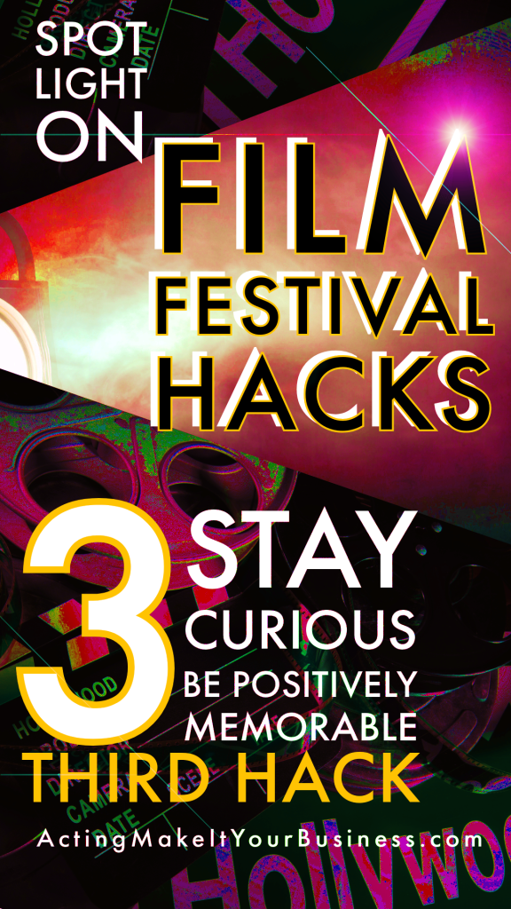 Hack number three: stay curious. Attend panels, ask questions and soak up all the knowledge you can. Film festivals are goldmines of insights from seasoned pros. Plus, asking thoughtful questions can make you memorable in the right way.